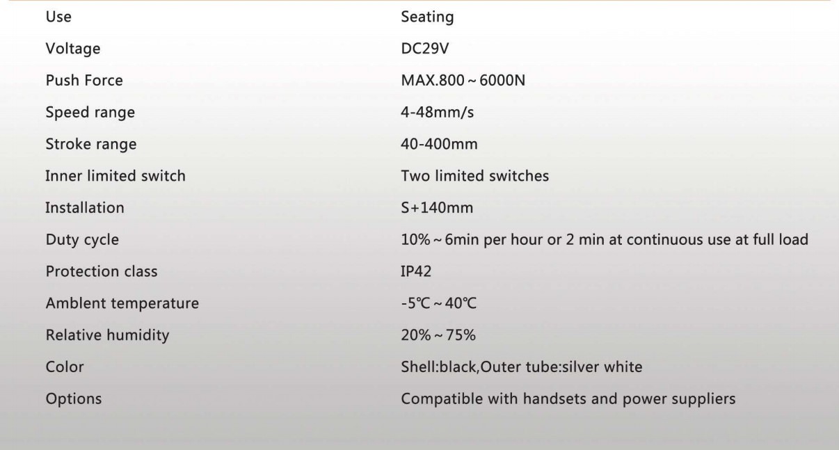 本產(chǎn)品已通過CE、UL、PSE、ISO9001認證,它有一個新穎的外觀和制作精良,噪音小,操作簡單,讓它成為暢銷國內(nèi)外,被廣泛用于電動沙發(fā)、醫(yī)療床、手術床,按摩椅等。