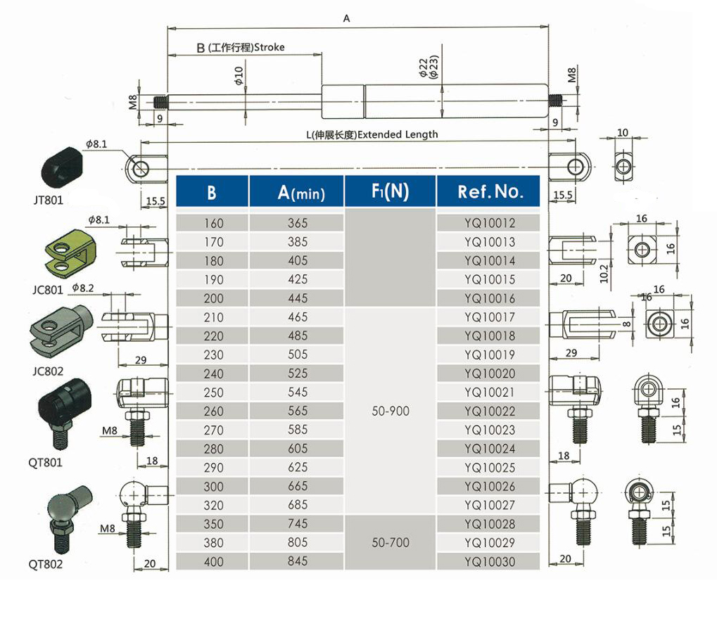 注:由于氣彈簧是非標(biāo)準(zhǔn)的,以上僅為型號(hào)的一部分。我們可以根據(jù)客戶的要求定制。