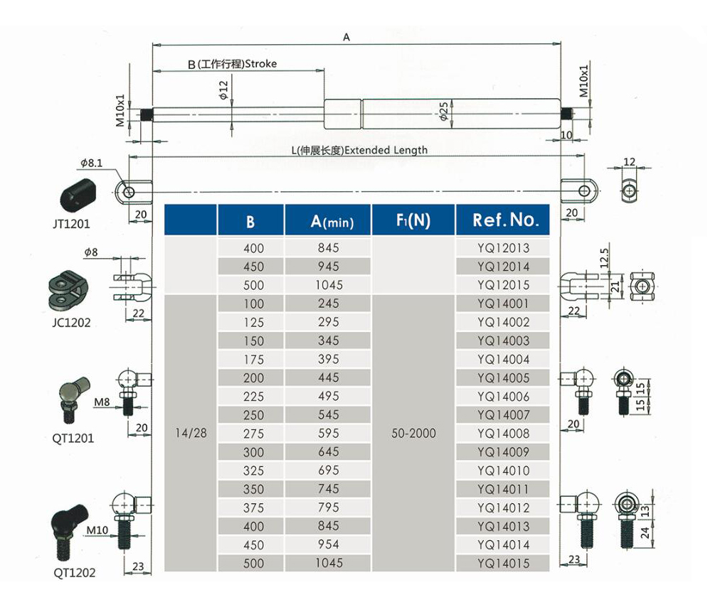 注:由于氣彈簧是非標準的,以上僅為型號的一部分。我們可以根據(jù)客戶的要求定制。