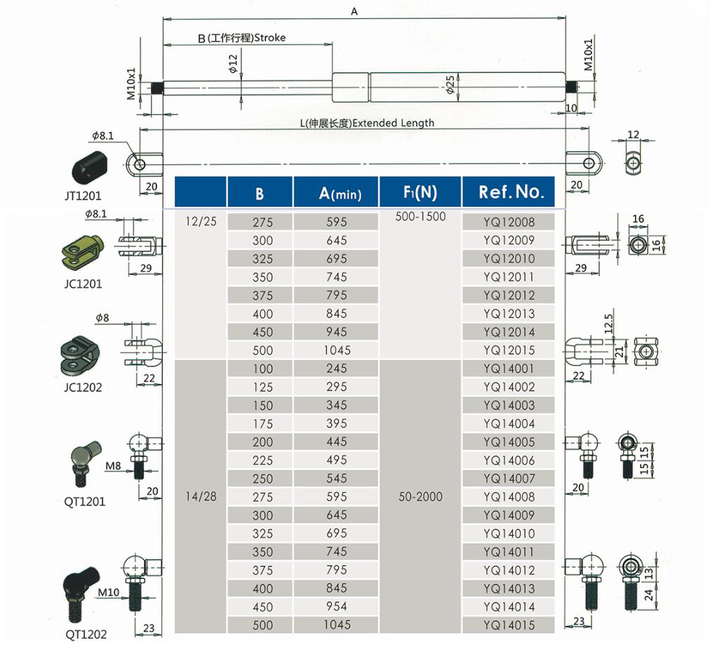 注:由于氣彈簧是非標(biāo)準(zhǔn)的,以上僅為型號(hào)的一部分。我們可以根據(jù)客戶的要求定制。