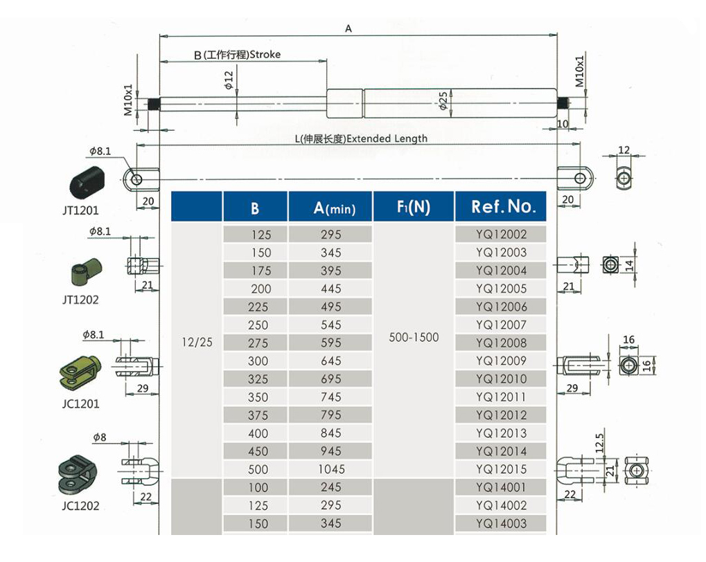 注:由于氣彈簧是非標(biāo)準(zhǔn)的,以上僅為型號(hào)的一部分。我們可以根據(jù)客戶的要求定制。